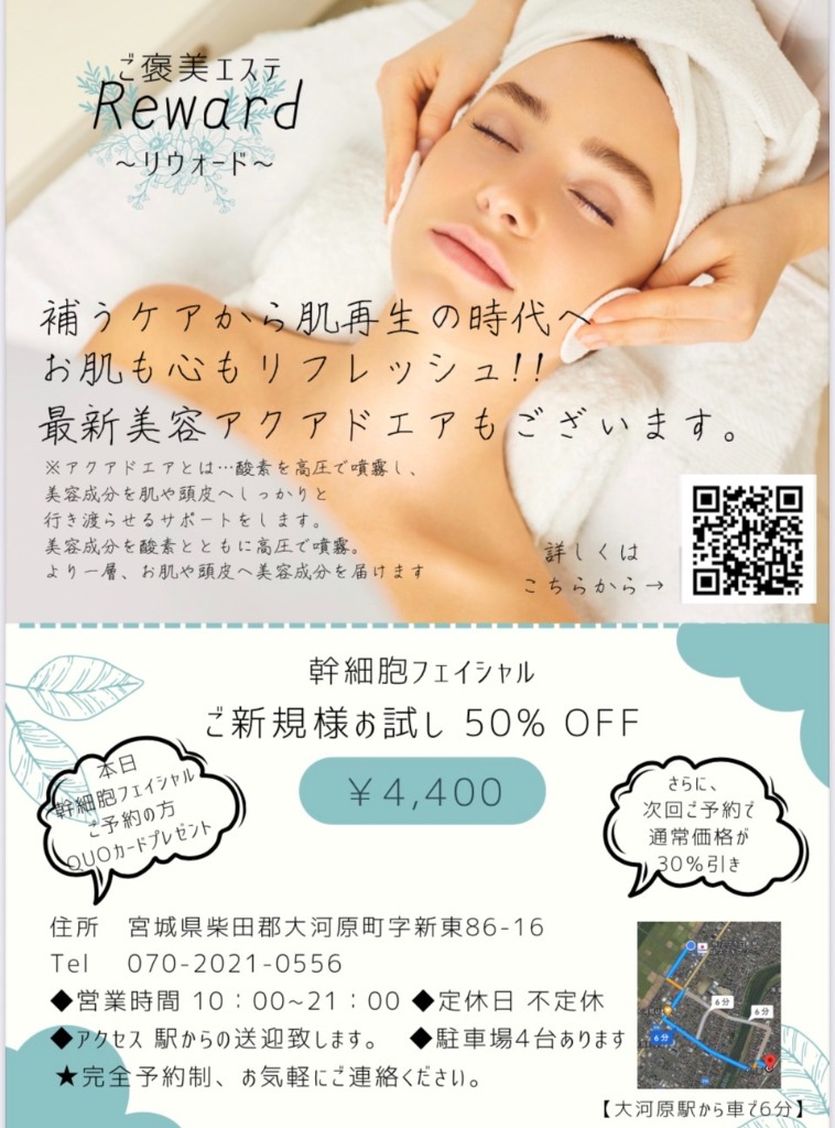 小顔や乾燥、たるみへのアプローチをするエステサロンなら柴田郡にある“ご褒美エステReward〜リウォード~”へ。
